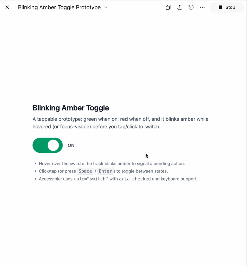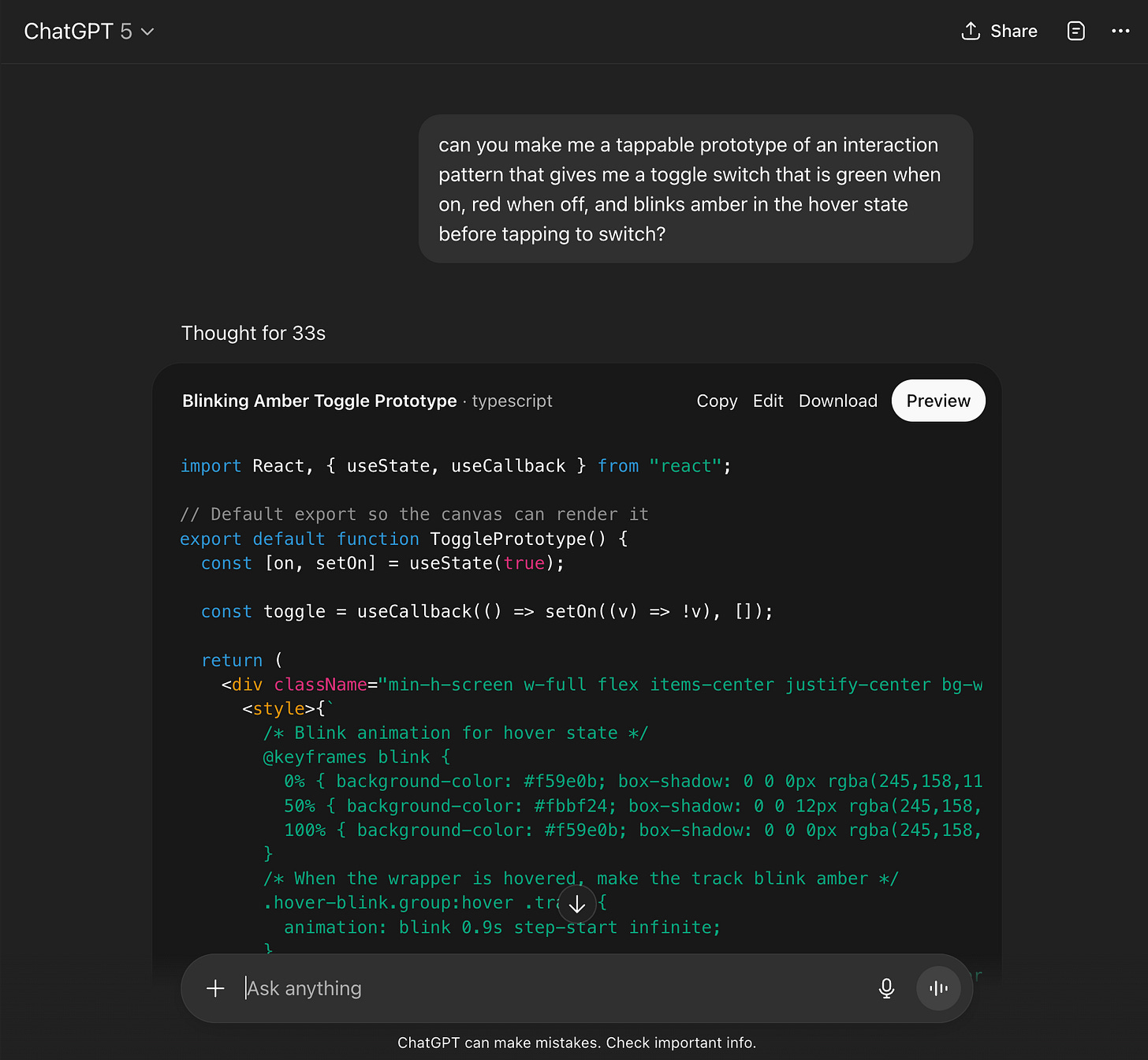Here’s an example. As I type this sentence I’m trying to think of a small product idea. The type of thing that might come out of a design sprint. Lightweight but worth exploring. Let’s go with a blinking hover state on a toggle switch—something to warn users before changing a high-risk setting. Not my best work, but you get the idea. I’m going to prompt GPT5 to build me a prototype.